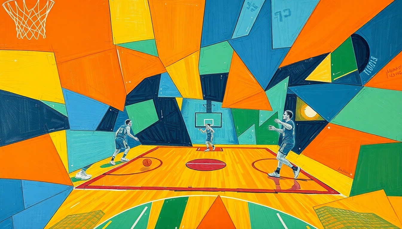 Ilustrasi pertandingan basket terbentuk dalam gaya kubisme