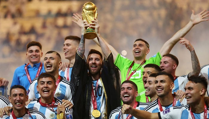 Lionel Messi dari Argentina mengangkat trofi saat merayakan kemenangan di Piala Dunia FIFA setelah mengalahkan Prancis di final di Stadion Lusail, Lusail, pada 18 Desember 2022. — Reuters