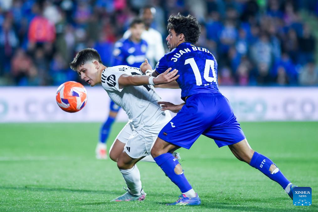 Arda Guler (kiri) berduel dengan Juan Bernat dari Getafe CF dalam pertandingan La Liga di Coliseum Stadium, Madrid, Spanyol, pada 23 April 2025. (Foto oleh Gustavo Valiente/Xinhua)
